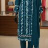 The true highlight of this collection is the meticulous embroidery and embellishments. Each kurta’s yoke and hemline are adorned with intricate patterns, featuring a mix of thread work, mirror work, and subtle metallic accents. For example, the maroon set features elegant turquoise and white thread work, while the green set has vibrant pink and mirror work. The blue kurta boasts stunning golden and pink embroidery, and the purple one shines with silver and white detailing. These beautiful patterns are not just on the kurta; a matching, embroidered border also adorns the hemline, tying the look together with a cohesive and polished finish.