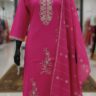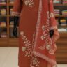 Crafted from premium quality Roman silk, this suit set offers a luxurious, silky-smooth texture and a beautiful natural sheen that elevates the entire look. The fabric feels wonderfully soft and lightweight against the skin, making it an ideal choice for long hours of wear without compromising on comfort. An inner is included, ensuring a smooth drape and added comfort. The straight-cut kurti features a graceful silhouette that flatters a variety of body types. The simple yet sophisticated design allows the exquisite details to truly shine. The three-quarter sleeves and a classic V-neckline contribute to a polished and chic look.