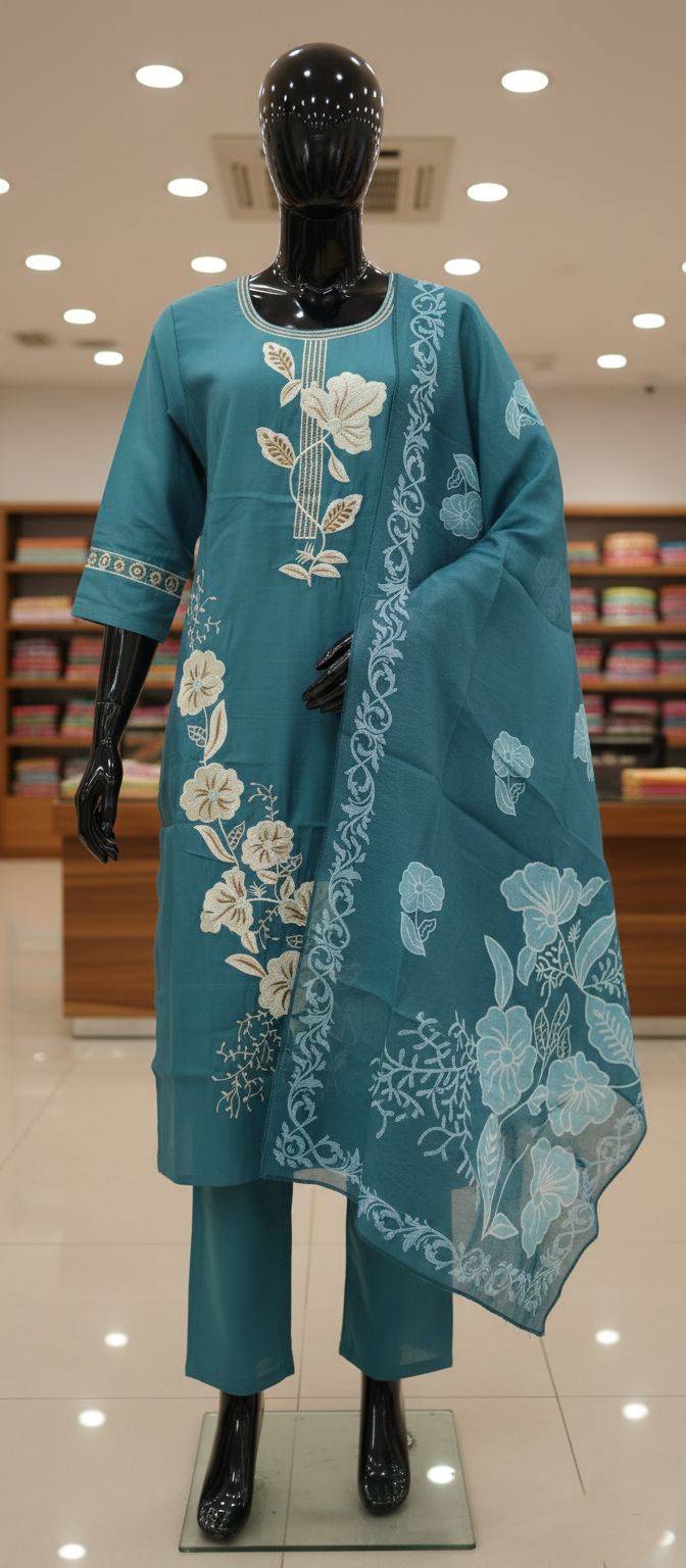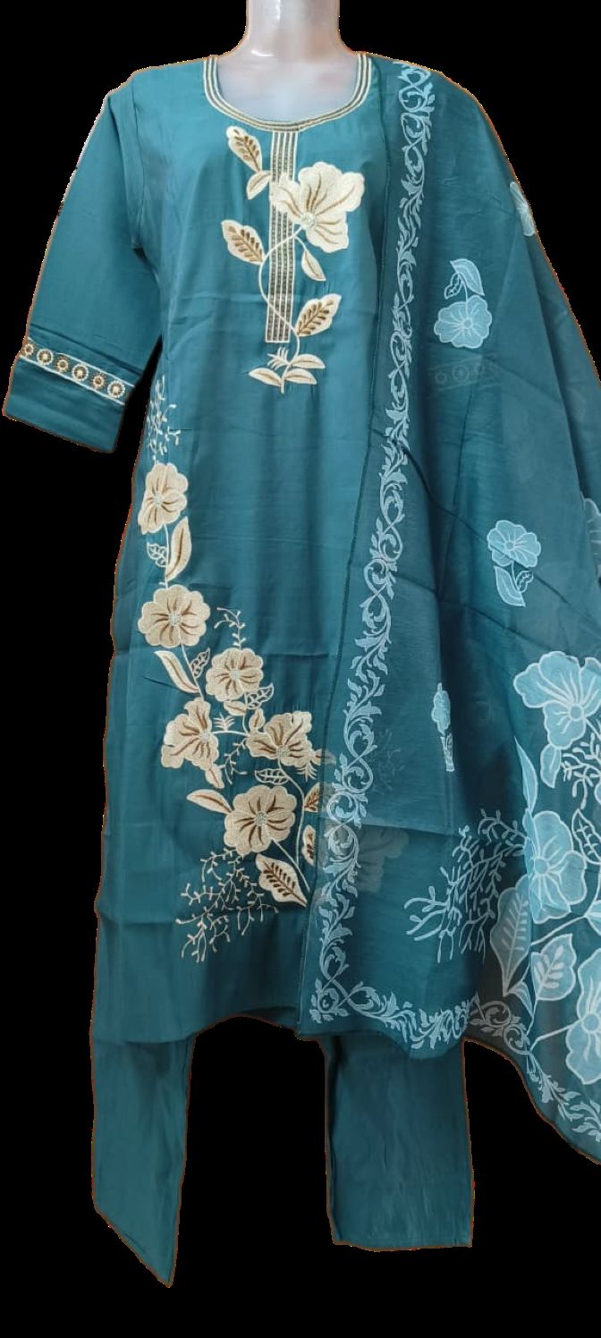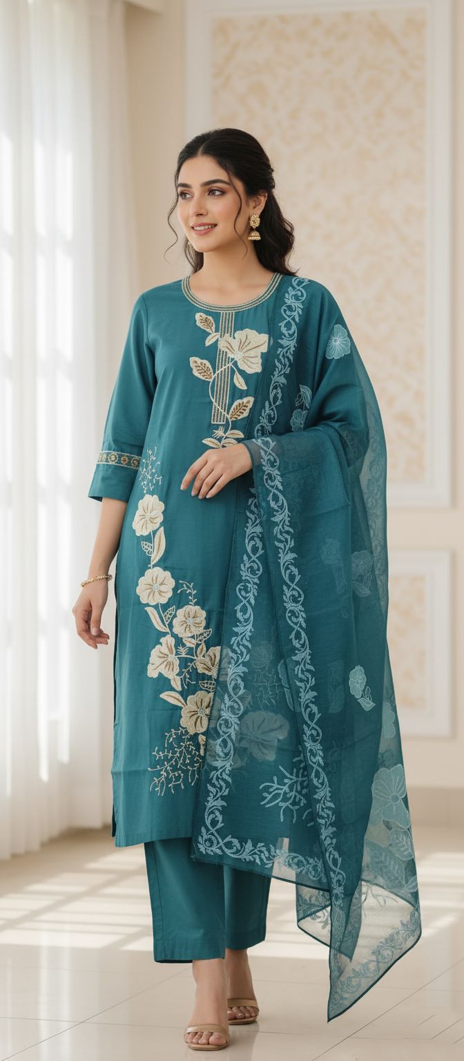 The ensemble is completed with a pair of solid dark teal trousers that are tailored for a relaxed and comfortable straight-cut fit. A functional pocket is included in the trousers, adding a practical and modern touch to the traditional silhouette. What truly elevates this outfit is the breathtaking floral Organza dupatta. Made from a sheer, lightweight organza fabric, the dupatta features a beautiful, large-scale floral print and a distinct, intricate border. This elegant and ethereal layer beautifully complements the suit’s embroidery, completing the look with perfect harmony. This suit set is a must-have for anyone looking to combine traditional craftsmanship with contemporary luxury and convenience.