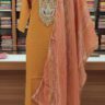 Crafted from premium quality Roman silk, this suit set offers a silky-smooth texture and a natural sheen that elevates the entire look. The fabric feels wonderfully soft against the skin, making it an ideal choice for long hours of wear without compromising on comfort. The anarkali features a full-length, flared silhouette that creates a graceful and flattering shape that moves beautifully with you. The long sleeves and classic V-neckline contribute to a refined and elegant look, allowing the rich embellishments to stand out and truly shine. The rich, solid color of the kurti serves as the perfect backdrop for the ornate details.