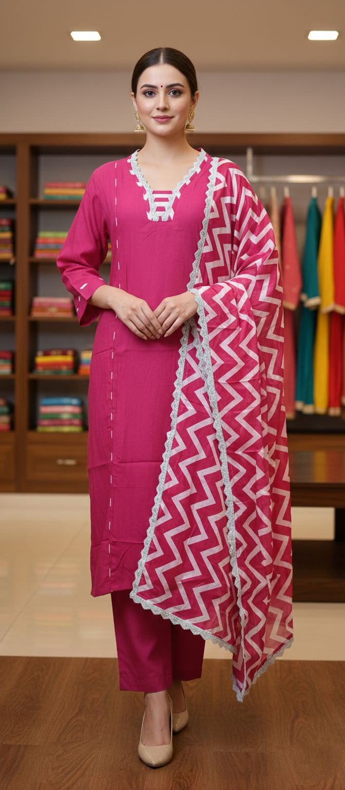 Magenta / Straight Cut Suit Pant Pocket / Roman Silk With Art Silk Dupatta