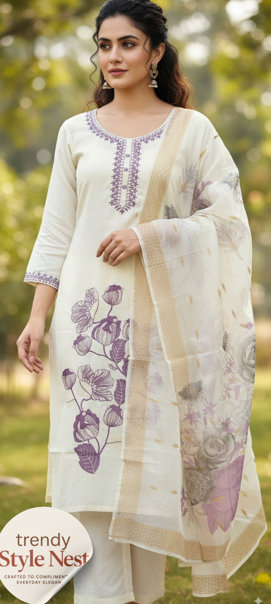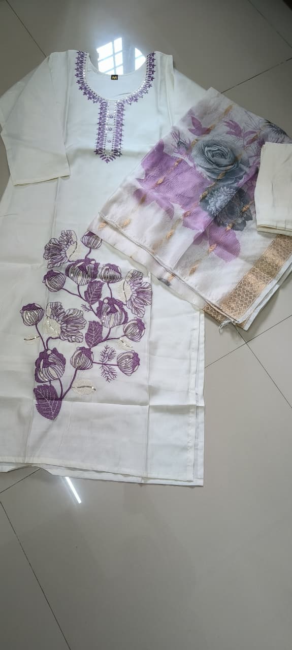 The true highlight of this outfit is the intricate thread embroidery on the neckline and front of the kurti. The design features a beautiful blend of floral and paisley motifs in a light purple and gray thread, creating a striking contrast against the off-white fabric.