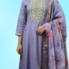 The ensemble is completed with a pair of matching straight-cut pants. What truly elevates this outfit is the sheer dupatta with its beautiful Zari border. This golden border adds a touch of classic elegance and perfectly complements the kurti’s embroidery. The dupatta is adorned with a soft floral print in shades of purple, completing the look with perfect harmony. This suit set is a must-have for anyone looking to combine traditional craftsmanship with contemporary luxury.