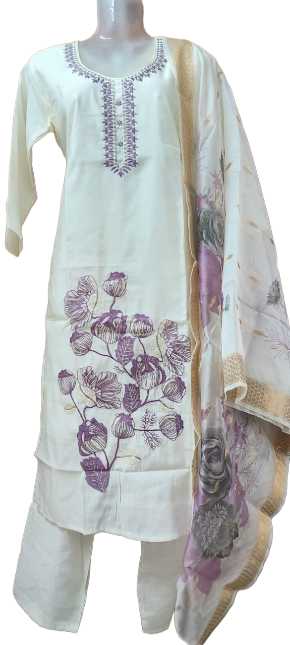 Off White / Roman Silk / Straight Cut Suit / Full Lining with Printed Organza Zari Board Dupatta