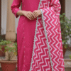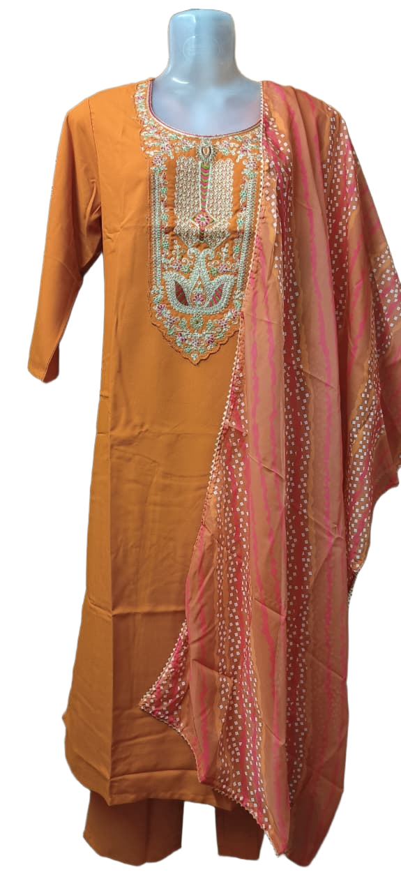 The ensemble is completed with a pair of solid rust orange trousers, tailored for a relaxed and comfortable fit, ensuring ease of movement. The crowning glory of this outfit is the breathtaking printed Chiffon dupatta. Made from a sheer, lightweight chiffon fabric, the dupatta features a bold and artistic print in a beautiful mix of colors, including various shades of orange and red, with a delicate dotted pattern. The borders of the dupatta have a distinct, woven design that adds a unique touch. This suit set is a must-have for anyone looking to combine traditional craftsmanship with contemporary style, offering a unique and personal look for every occasion.