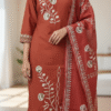 Drape yourself in warm, earthy tones with this beautiful Rust Orange Muslin Silk Suit Set. This elegant three-piece ensemble is designed for the modern woman who seeks a perfect blend of rich color and traditional sophistication. The captivating rust orange hue is both unique and vibrant, making this outfit a standout choice for festive occasions, social gatherings, or any special event. The luxurious feel of the Muslin Silk fabric ensures you look and feel radiant wherever you go.