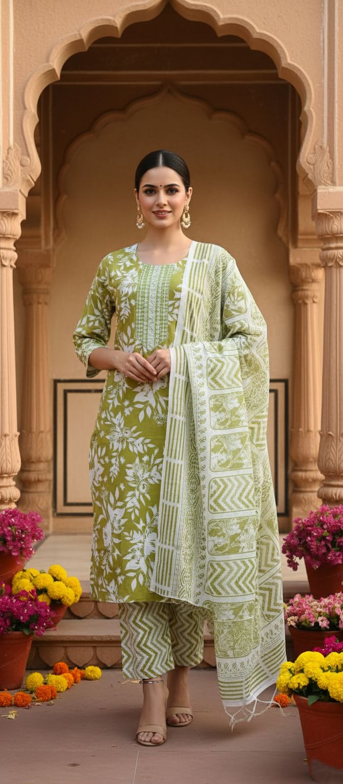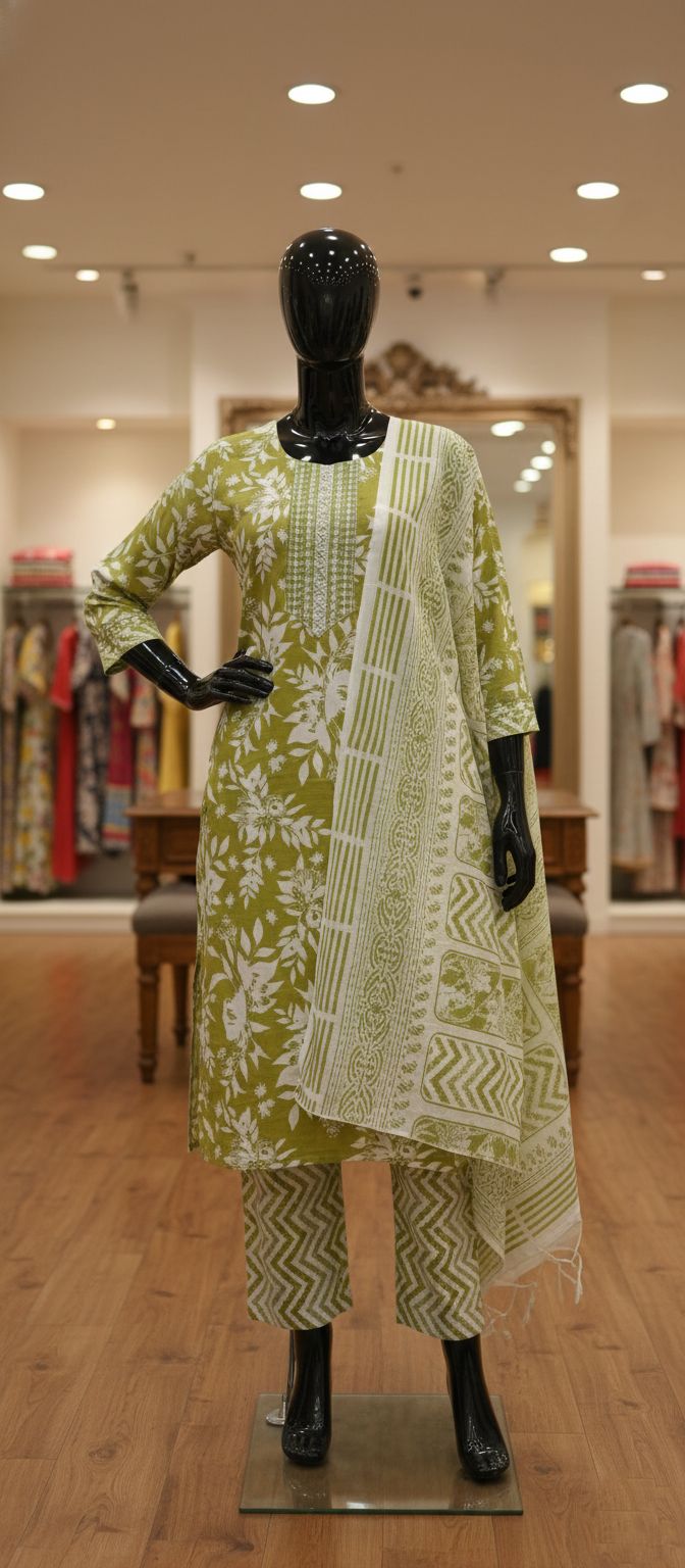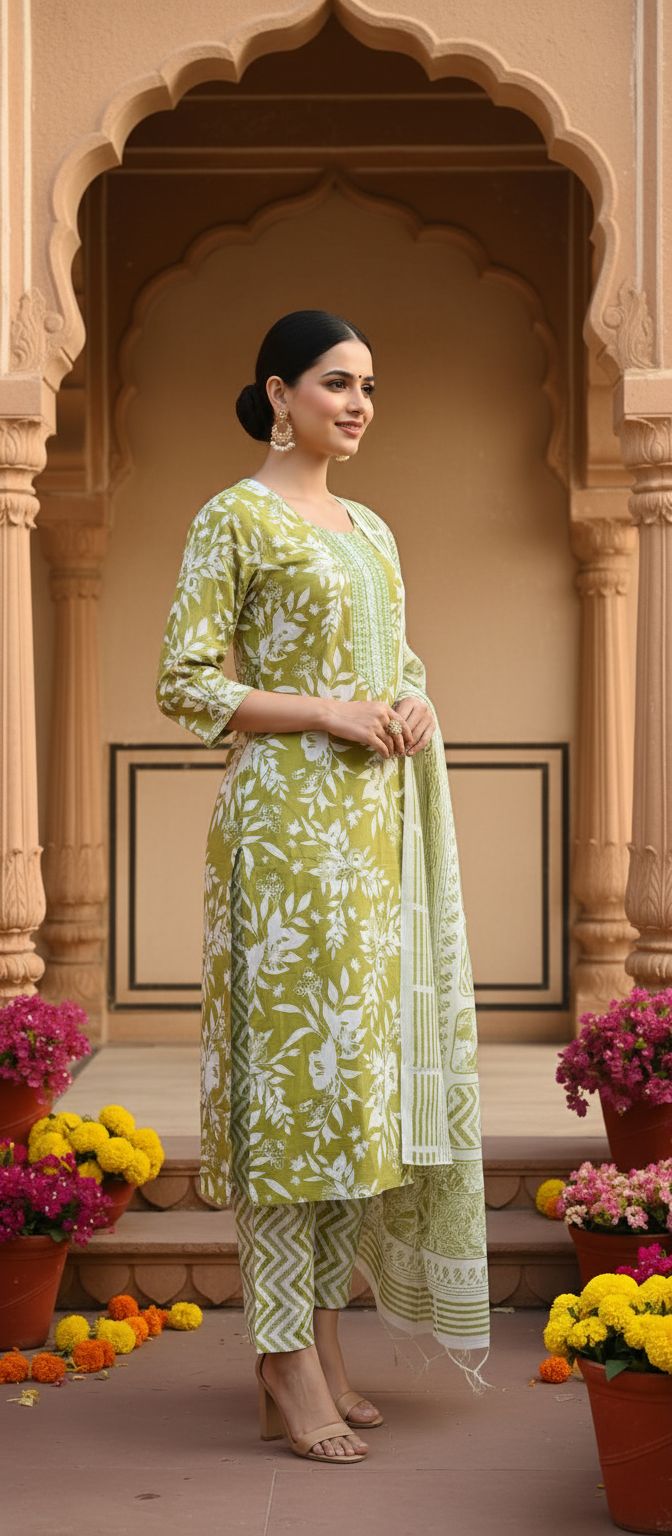Crafted from high-quality cotton, this suit offers a wonderfully soft, comfortable, and breathable feel, ensuring you stay cool while looking polished. The straight-cut kurti features a graceful silhouette that drapes beautifully. The true highlight of this set is the intricate work that adorns the kurti. The V-neckline is beautifully detailed with a delicate combination of white and black embroidery. The rest of the kurti is adorned with a charming mix of a geometric pattern and large, artistic floral motifs in a contrasting golden-brown shade. Subtle sequence tie work is scattered across the kurti, adding a gentle shimmer that catches the light beautifully.