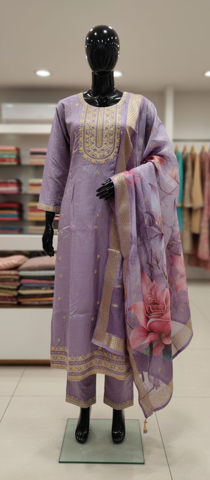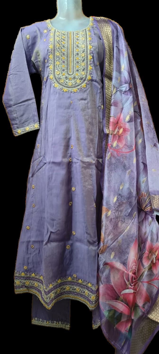 Violate Roman Shimmer Anarkali With Printed Organza Dupatta / Pant Pocket / Zari Embroidery Work