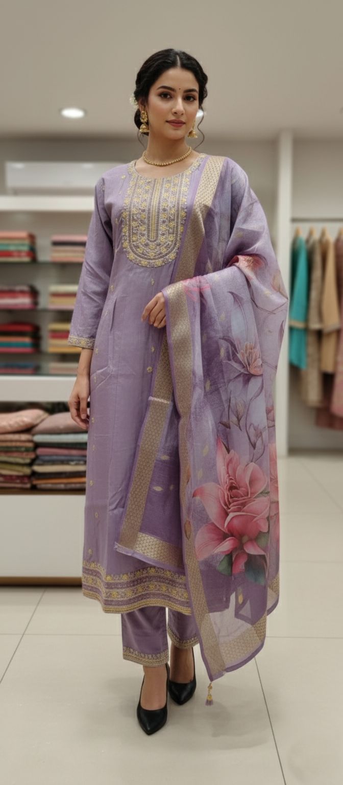 Drape yourself in luxurious elegance with this stunning Violet Roman Shimmer Silk Anarkali Suit Set. This three-piece ensemble is meticulously crafted for the modern woman who appreciates rich color and sophisticated details. The captivating violet color is both unique and beautiful, while the luxurious Roman Shimmer Silk fabric provides an opulent feel with a subtle, shimmering effect. The flared Anarkali silhouette ensures you make a grand entrance at any wedding, festive celebration, or formal event.