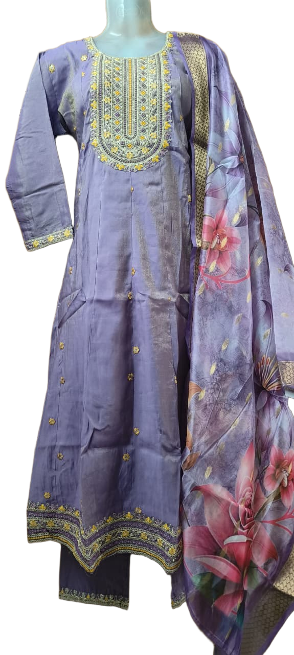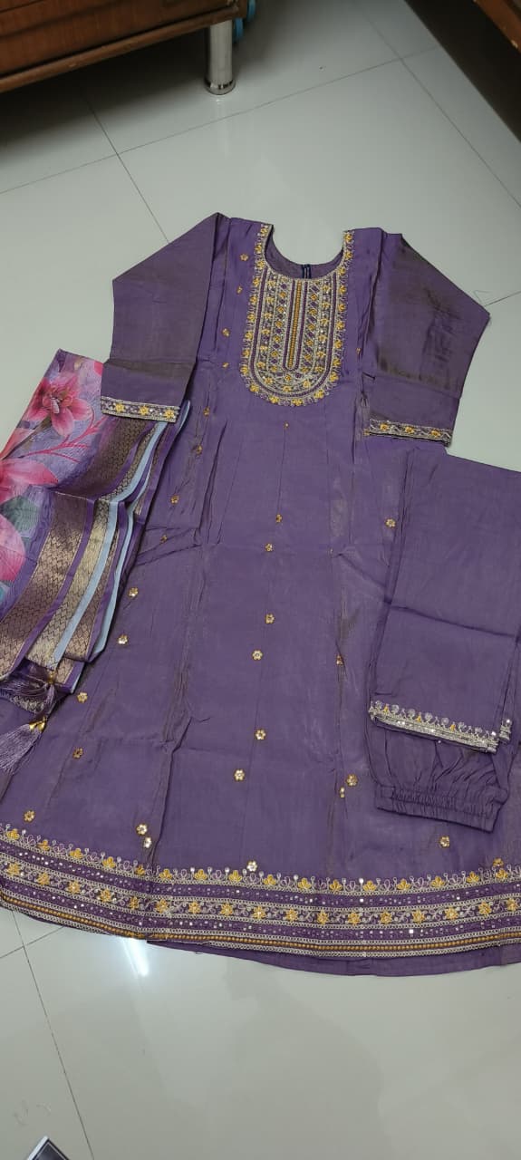 Violate Roman Shimmer Anarkali With Printed Organza Dupatta / Pant Pocket / Zari Embroidery Work