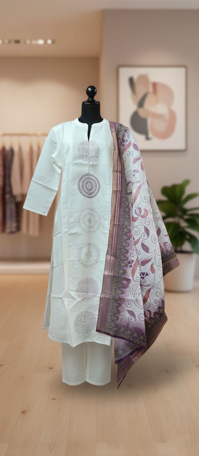 Pure White Roman Silk, Straight Cut Suit / Full Lining / Printed Dupatta with Zari boarder