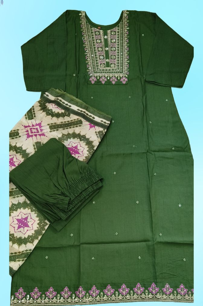 The ensemble includes a pair of solid green trousers that are tailored for a comfortable fit, ensuring the outfit is easy to wear all day long. The most striking element, however, is the captivating printed dupatta. The dupatta features a bold, geometric pattern in shades of magenta, off-white, and green, beautifully complementing the embroidery on the kurti. The contrasting print of the dupatta adds a modern, dynamic touch to the traditional suit, making it a truly unique piece. This suit set is a must-have for your wardrobe, offering the perfect combination of traditional craftsmanship and contemporary style.