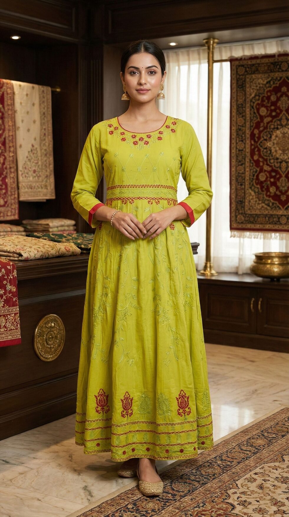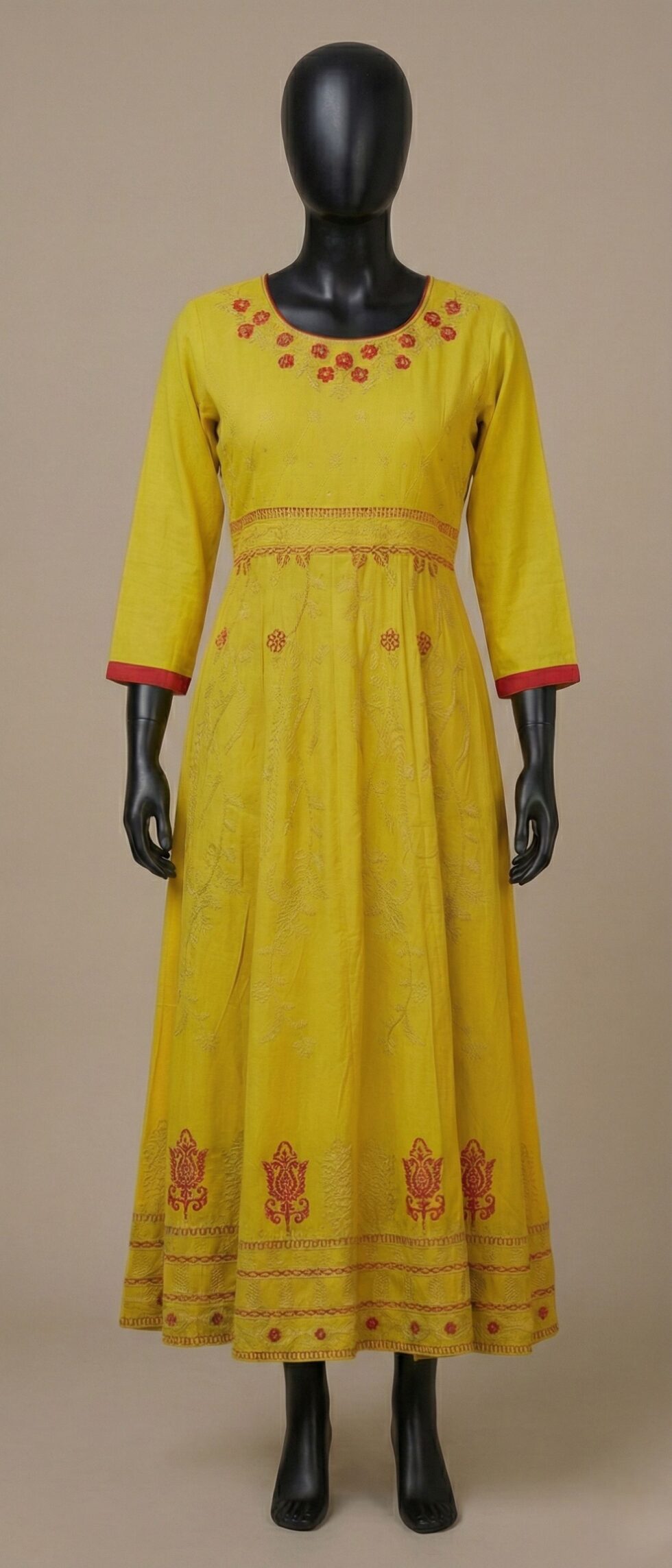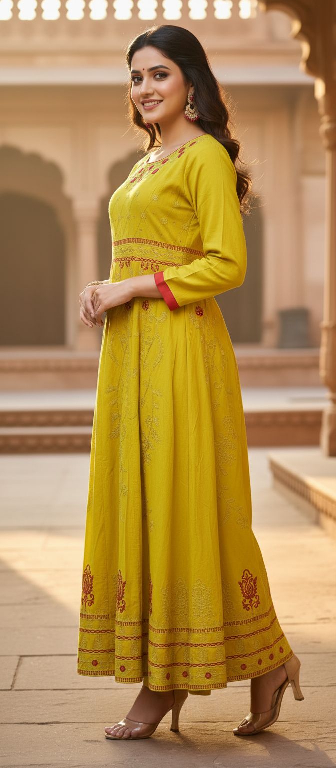 Make a vibrant statement with this stunning Mustard Yellow Heavy Rayon Anarkali Dress. This one-piece outfit is a perfect blend of a lively color palette and rich, intricate craftsmanship. The bright mustard yellow hue creates a joyful and celebratory feel, making this dress an ideal choice for festive gatherings, parties, or special occasions. The beautiful, full flare of the dress provides a graceful and elegant silhouette.