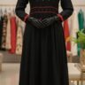 Design: The design is a sophisticated blend of a traditional flared silhouette with intricate, hand-finished embroidery.