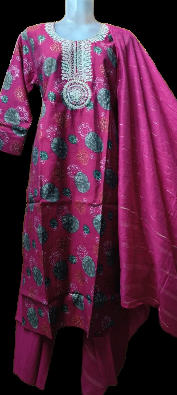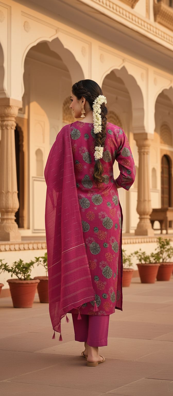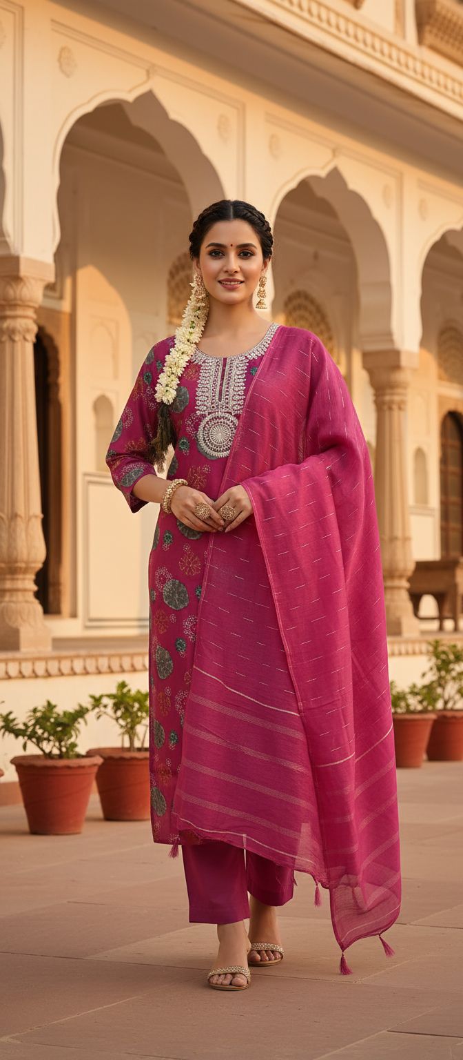 Make a striking statement with this vibrant Hot Pink Roman Silk Suit Set. This exquisite three-piece ensemble is a perfect fusion of bold color and intricate, traditional craftsmanship. The stunning hot pink hue provides a lively backdrop for the beautiful embroidery and embellishments, making this outfit a standout choice for any festive event, party, or special occasion.
