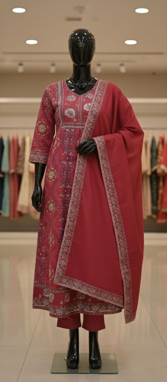 Women’s Cotton Anarkali Embroidery Designer Long Anarkali Kurti With Pant and Dupatta Set (Red)